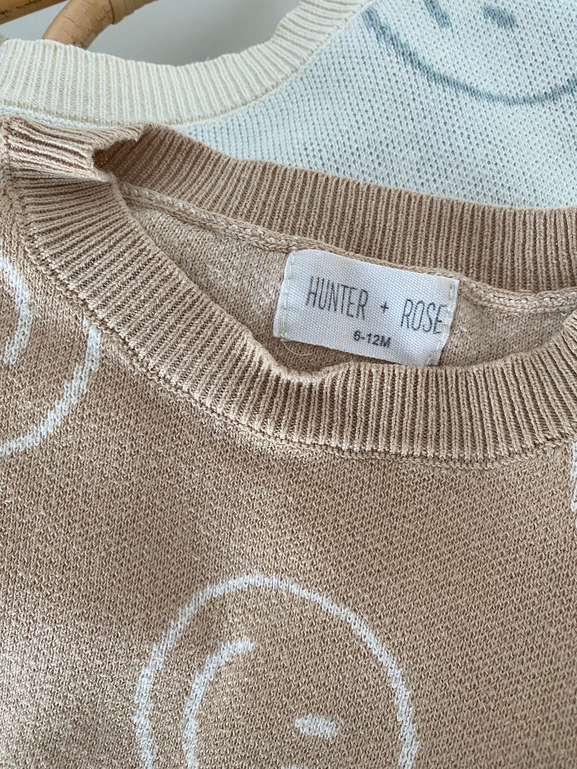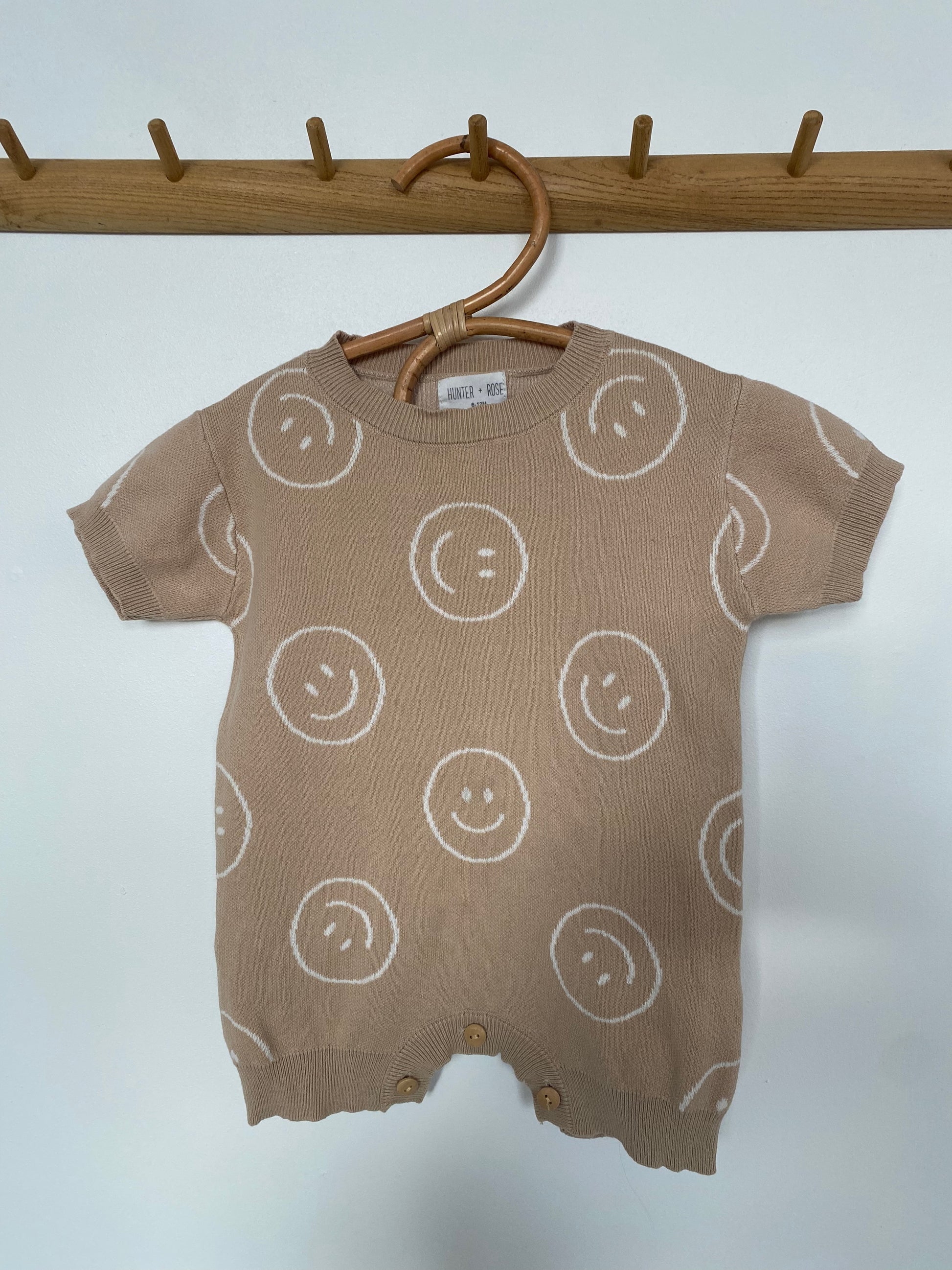 6-12M Hunter + Rose beige smiley face knitted romper